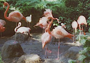 kun rozkoloraj kaj ruĝaj plumoj, ofte staranta sur nur unu piedo,