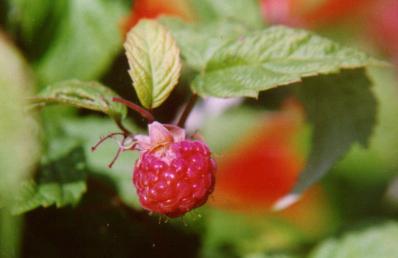 kun ruĝaj plurfruktoj (Rubus idaeus):