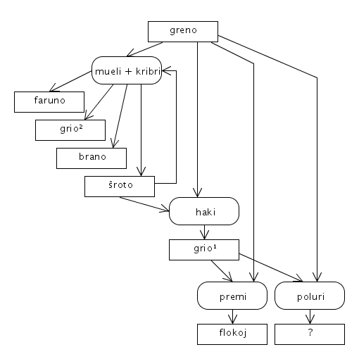 - Krude muelita tritiko, semolo: sed multe pli impone estas, ke en ĝi ni ricevas varman kaĉon el grio [3]; miksaĵo de faruneca substanco (rizo, maizamelo, grio aŭ similaĵo) kaj lakto […] post malvarmiĝo, servita kiel deserto [4].