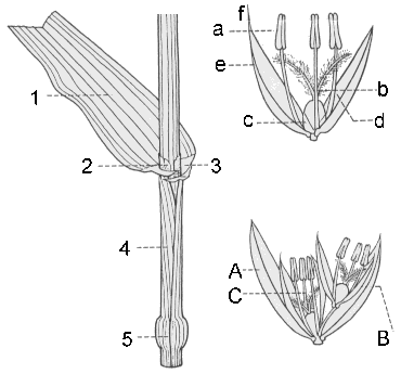 A. ekstera glumo, B. interna glumo, C. unuopa floro